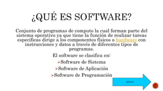 El documento describe las diferentes partes de una computadora, incluyendo el software (sistemas operativos, aplicaciones, programas) y el hardware (componentes físicos como la CPU, memoria, periféricos de entrada/salida y almacenamiento). Explica que el software dirige el hardware a través de instrucciones y datos, y clasifica el software en sistemas, aplicaciones y programación, mientras que el hardware incluye la CPU, memoria y periféricos.
