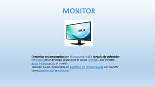 El documento describe las principales partes de una computadora: el monitor, que muestra datos e información al usuario; la CPU, que es el cerebro de la computadora donde se realizan la mayoría de los cálculos; el teclado, que envía información a la computadora a través de teclas o botones; y el mouse, un dispositivo apuntador que detecta su movimiento relativo en dos dimensiones y controla un cursor en la pantalla.
