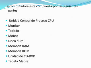 Las principales partes de una computadora incluyen la unidad central de proceso (CPU), monitor, teclado, mouse, disco duro, memoria RAM y ROM, unidad de CD/DVD y la tarjeta madre. La CPU procesa la información, el monitor muestra las imágenes, el teclado y mouse permiten la entrada de datos, el disco duro almacena de forma permanente, la RAM almacena temporalmente durante el uso y la ROM almacena de forma permanente los programas iniciales.