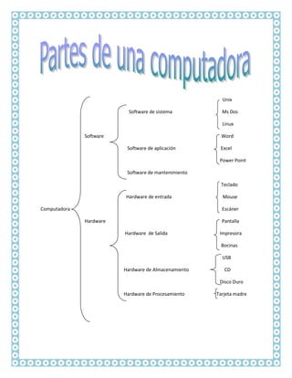 El documento lista diferentes tipos de software y hardware de computadoras, incluyendo sistemas operativos como Unix y MS-DOS, software de aplicación como Word y Excel, hardware de entrada como teclado y mouse, hardware de salida como pantalla e impresora, y hardware de almacenamiento y procesamiento como USB, CD, disco duro y tarjeta madre.
