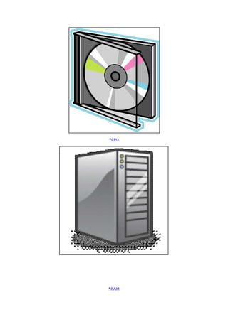 El documento describe los principales componentes de una computadora, incluyendo el teclado, mouse, CD-ROM, CPU, RAM, disco duro, ROM, DVD, pantalla, puerto USB y bocinas. Cada componente se define brevemente y se proporciona un enlace para obtener más información sobre su función.