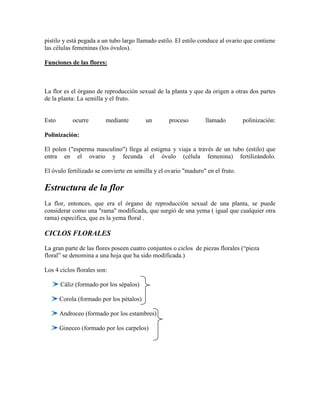 El documento describe las partes principales de una flor. Las flores son órganos reproductivos modificados de las plantas. Constan típicamente de cuatro partes: el cáliz, la corola, el androceo y el gineceo. El cáliz y la corola protegen las partes reproductivas internas. El androceo contiene los estambres masculinos que producen el polen. El gineceo contiene el pistilo femenino con los óvulos. La polinización involucra el transporte del polen al óvulo para