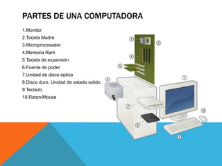 El documento describe las 10 partes principales de una computadora: 1) monitor, 2) tarjeta madre, 3) microprocesador, 4) memoria RAM, 5) tarjeta de expansión, 6) fuente de poder, 7) unidad de disco óptico, 8) disco duro, 9) teclado y 10) ratón. Cada parte juega un papel fundamental en el funcionamiento general de la computadora.