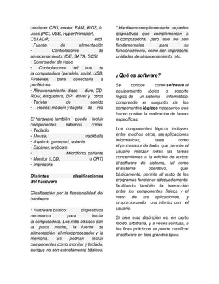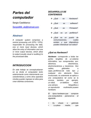 Este documento describe las principales partes de un computador, incluyendo el hardware, software y firmware. El hardware se refiere a las partes físicas como la placa madre, CPU y periféricos. El software incluye al sistema operativo y aplicaciones. El firmware son instrucciones grabadas en memoria que controlan circuitos electrónicos. También explica conceptos como puertos de comunicación y cómo otros dispositivos se pueden conectar a una computadora.