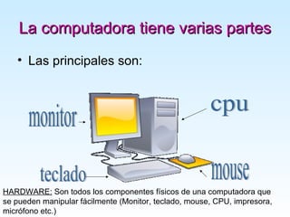 Este documento describe las principales partes de una computadora, incluyendo el hardware y software. El hardware se refiere a los componentes físicos como el monitor, teclado, mouse, CPU e impresora. El software son las instrucciones que le dicen al hardware qué hacer y incluyen programas como el sistema operativo. El documento también explica brevemente las funciones del monitor, teclado, mouse y CPU.