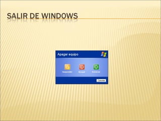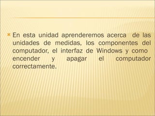 Este documento trata sobre la Unidad #2 de Informática. Explica conceptos básicos como bits, bytes, kilobytes, megabytes y gigabytes. También describe los componentes principales de una computadora como el procesador, memoria RAM y periféricos. Finalmente, detalla los pasos para encender y apagar correctamente una computadora con Windows XP.