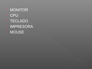 El documento describe los principales componentes de un ordenador: el monitor muestra los resultados de las operaciones, la CPU procesa las instrucciones de los programas, el teclado envía información mediante teclas, la impresora produce copias impresas de documentos electrónicos, y el ratón facilita la navegación en un entorno gráfico.