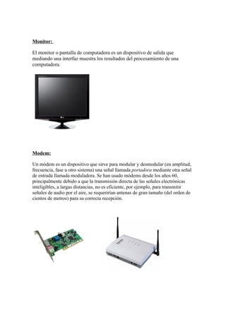 El documento describe las principales partes físicas de un computador, incluyendo dispositivos de entrada como teclado, ratón y escáner; dispositivos de salida como monitor, impresora y bocinas; y unidades de almacenamiento como disco duro y unidades de discos ópticos. También explica brevemente el funcionamiento de otros componentes como la CPU, modem y lápiz óptico.