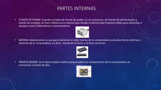 El documento describe las principales partes internas y externas de una computadora. Las partes internas incluyen la fuente de poder, batería, tarjeta madre, disco duro, memoria RAM, tarjeta de sonido, tarjeta de video, ventilador y procesador. Las partes externas incluyen el mouse, teclado, gabinete, monitor, impresora, scanner, micrófono y bocinas.