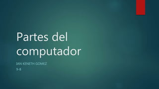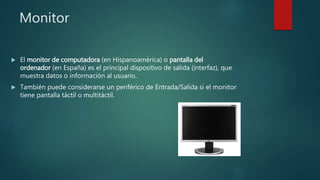 El documento describe las principales partes de una computadora, incluyendo el monitor, teclado, CPU, mouse, RAM, CD-ROM, fuente de alimentación, impresora, tarjeta gráfica y USB. Cada parte juega un papel importante en el funcionamiento general de la computadora.