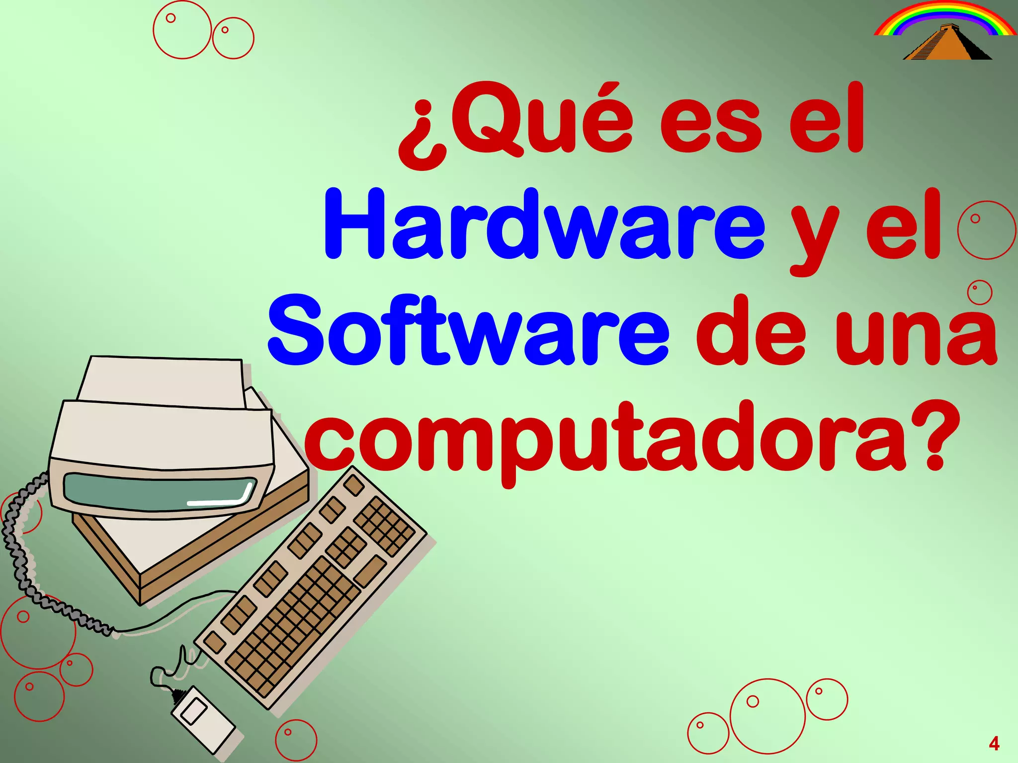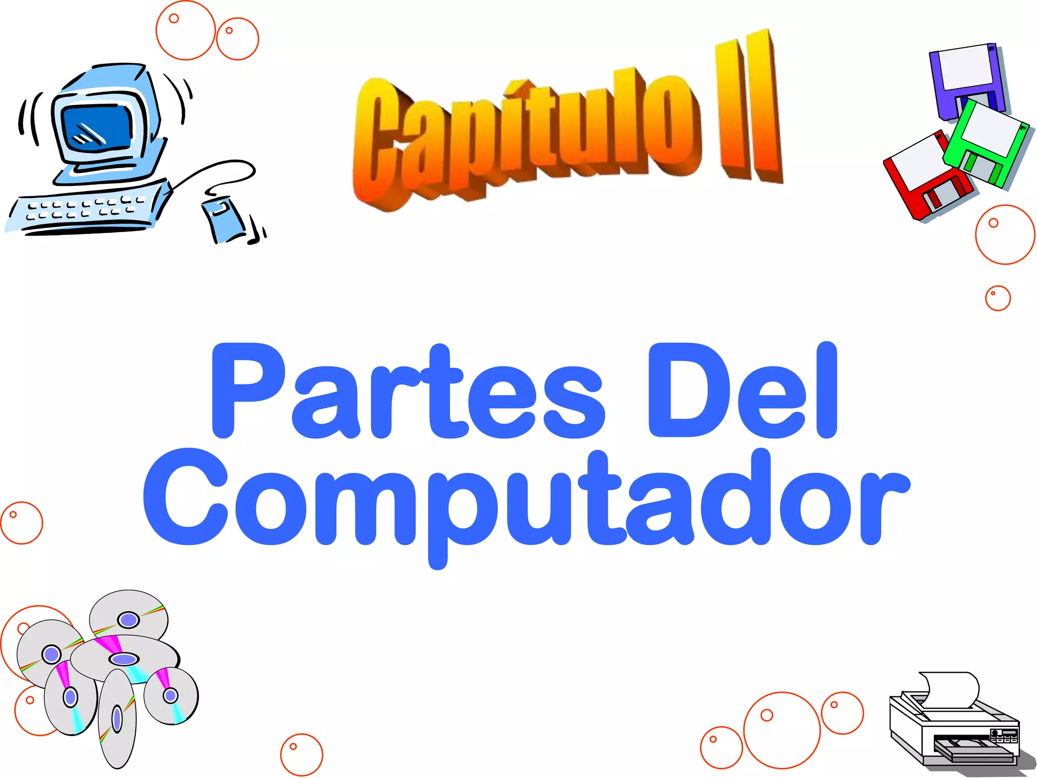 El documento describe los componentes principales de una computadora, incluyendo el hardware y el software. El hardware se compone de dispositivos de entrada como teclados y mouse, dispositivos de salida como monitores e impresoras, dispositivos de memoria como RAM y discos duros, y el procesador o CPU. El software incluye programas que se ejecutan en el hardware. El documento también cubre virus informáticos y formas de prevenir infecciones.