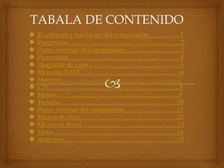Este documento describe los componentes de hardware y software de un computador. Explica las partes internas y externas de un computador como la tarjeta madre, procesador, memoria RAM, monitor, mouse, teclado y discos duros. También describe programas como el sistema operativo, Microsoft Office, Microsoft Word, y define conceptos como virus y antivirus.