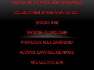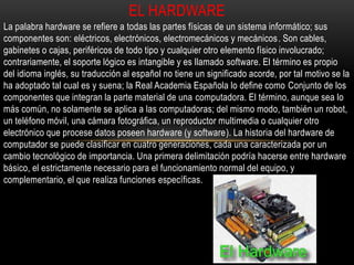 Este documento describe los principales componentes de hardware de una computadora. Estos incluyen la unidad central de procesamiento (CPU), la memoria RAM, el microprocesador, la tarjeta madre, el monitor, los parlantes, el teclado, el mouse y otros periféricos. El hardware se refiere a las partes físicas de un sistema informático.