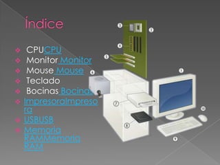 El documento describe las principales partes del hardware de una computadora, incluyendo la CPU, monitor, mouse, teclado, bocinas, impresora, USB, memoria RAM y sus funciones. Explica que la CPU procesa los datos e instrucciones de los programas, el monitor muestra la información visualmente, el mouse facilita las interacciones del usuario, y el teclado permite escribir datos e instrucciones.