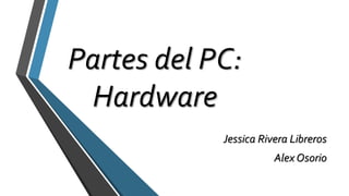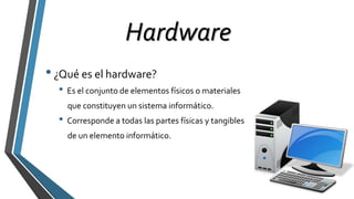 El documento describe las principales partes del hardware de una computadora personal, incluyendo la torre que contiene la placa base, memoria RAM, disco duro y tarjetas, el procesador, el monitor y sus diferentes tipos como CRT, plasma y LCD, el teclado para ingresar datos, y el mouse para navegar e interactuar con la interfaz gráfica.