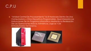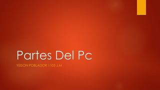 Este documento describe las principales partes de una computadora. Identifica el CPU, monitor, ratón, teclado, parlantes, impresora, micrófono, fuente de poder, memorias (RAM y ROM), disco duro, tarjeta de video, tarjeta de sonido, motherboard y ventiladores como los componentes clave de una PC y brinda una breve descripción de cada uno.