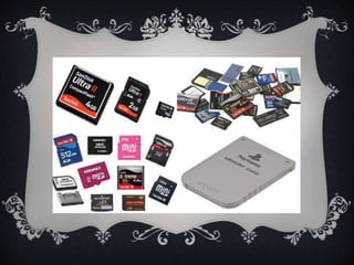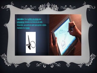 Este documento describe diferentes partes de una computadora, incluyendo periféricos de entrada como el teclado, ratón, joystick y lápiz óptico. También describe periféricos de salida como el monitor, altavoces e impresora. Por último, menciona dispositivos de almacenamiento como CD-ROM, DVD y disquetes.