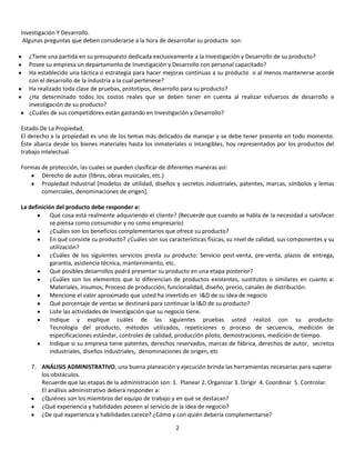 Este documento describe las diferentes secciones que componen un plan de negocios, incluyendo la introducción ejecutiva, definición de la industria y la compañía, análisis DAFO, descripción del producto, investigación y desarrollo, análisis administrativo, de mercado, de producción, organización y recursos humanos, análisis financiero y de riesgos. El documento provee preguntas guía para cada sección con el fin de analizar exhaustivamente todos los aspectos relevantes del negocio.