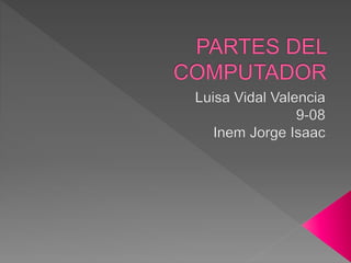 La tarjeta madre alberga los conectores para las demás tarjetas como la de video, sonido y red. El microprocesador es el componente principal de una computadora y se ubica en la tarjeta madre, procesando datos a altas velocidades. La memoria RAM almacena temporalmente datos y programas durante el funcionamiento de la computadora. Dispositivos de entrada como el teclado y mouse permiten ingresar datos, mientras que la salida ocurre a través del monitor, impresora y altavoces. Unidades como el disco duro y USB almacenan inform