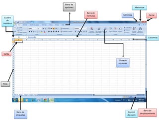 El documento describe las partes principales de Excel, incluyendo la barra de fórmulas, la cinta de opciones, la barra de opciones, las filas, las columnas, el cuadro de nombres y la celda. El documento también proporciona información sobre el estudiante Francisco Javier Martínez Aguilar del grupo 303 en el Conalep Tlalnepantla 1.