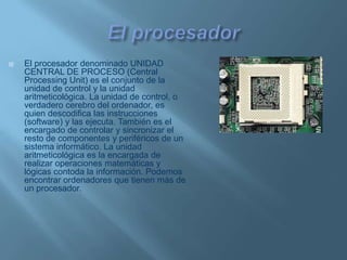 El documento describe las principales partes de una computadora personal. Estas incluyen el procesador, que es el cerebro de la computadora y se encarga de procesar instrucciones y controlar los otros componentes; la placa base, que conecta todos los dispositivos; la tarjeta de video, que muestra la información gráfica en la pantalla; y la tarjeta de sonido, que permite reproducir y grabar audio. Otros componentes clave son la memoria, donde se almacena la información; el teclado y mouse para la entrada; y la pantalla para la sal