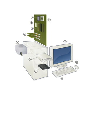La computadora está compuesta por una unidad central de procesamiento, memoria y unidades de entrada y salida. Incluye periféricos como monitor, teclado, ratón, impresora y escáner. Siguiendo la arquitectura de von Neumann, la memoria almacena instrucciones y datos que son procesados por la unidad central de procesamiento para producir resultados que pueden mostrarsen en la salida.