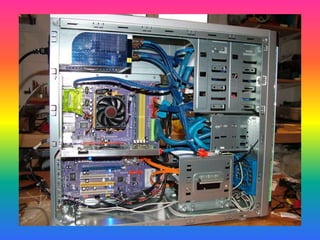 El documento describe las principales partes internas de una computadora, incluyendo el disco duro que almacena la información de manera permanente, el microprocesador que funciona como el cerebro de la computadora procesando operaciones lógicas y aritméticas, y la tarjeta madre que conecta y ordena todos los componentes internos.