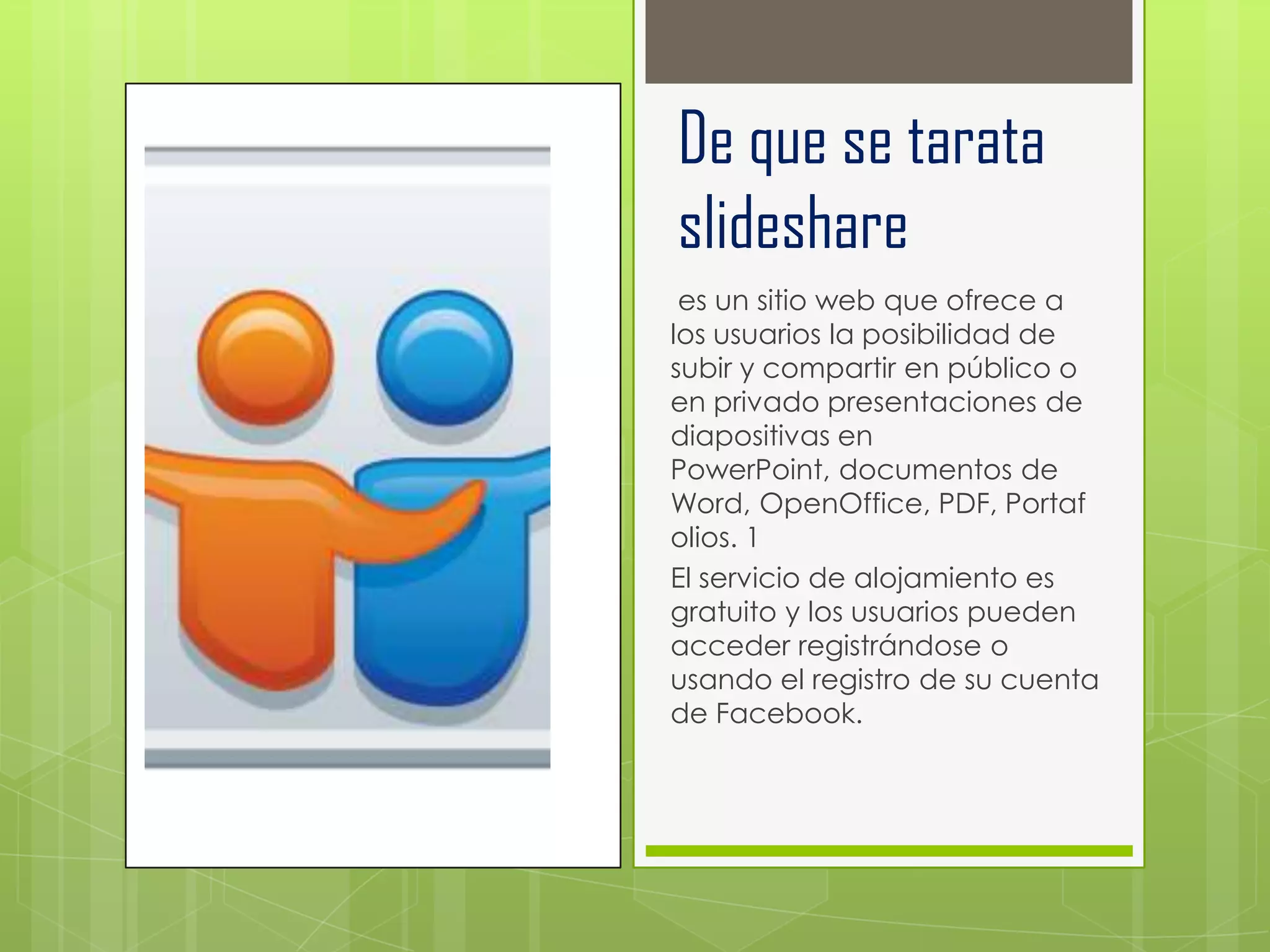 SlideShare es un sitio web que permite a los usuarios subir y compartir presentaciones de diapositivas de PowerPoint, documentos de Word, PDF y otros formatos de manera pública o privada. Los usuarios pueden crear una cuenta de forma gratuita y cargar archivos para compartirlos. El sitio web se utiliza tanto para compartir presentaciones entre compañeros de trabajo como presentaciones públicas para entretener a otros.