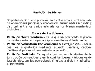 La partición es el conjunto de operaciones jurídicas y económicas para dividir y distribuir los bienes mantenidos proindiviso entre los asignatarios. Existen tres clases de particiones: la testamentaria establecida en el testamento, la voluntaria convencional acordada por los asignatarios de forma extrajudicial, y la judicial ventilada en la jurisdicción contenciosa donde jueces y tribunales dividen y adjudican el patrimonio.