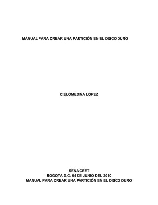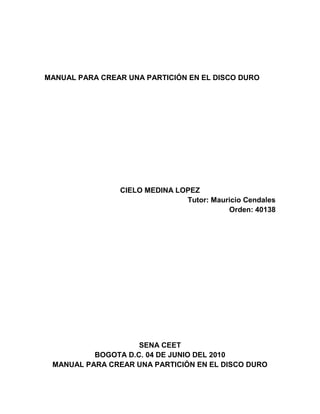 El documento explica cómo crear particiones en un disco duro para organizar el espacio de almacenamiento. Detalla los pasos para crear una partición primaria en Windows XP e instalar el sistema operativo en ella, y luego formatear el espacio restante para usarlo como otra partición. También define qué son las particiones y los diferentes tipos, y los sistemas de archivos más comunes como FAT, NTFS y Ext2/3/4 utilizados en Windows y Linux.