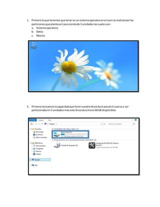 Este documento describe los pasos para particionar un disco duro de 60 GB en tres particiones usando el software Hiren's Boot. Primero se revisa la capacidad del disco duro. Luego se ejecuta el software y se accede a la opción de particionado. Se reduce la capacidad de la partición principal a 20 GB y se crean dos particiones adicionales de 20 GB cada una para datos y música. Finalmente, se aplican los cambios reiniciando el ordenador, completando el proceso de particionado con éxito.
