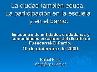 El documento describe la participación de las comunidades escolares en España. Discutió los antecedentes históricos y legales de la participación de profesores, estudiantes, familias y la comunidad. También analizó los principales problemas de participación que enfrentan estos grupos y dio ejemplos exitosos de escuelas democráticas que promueven la participación.
