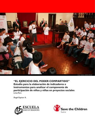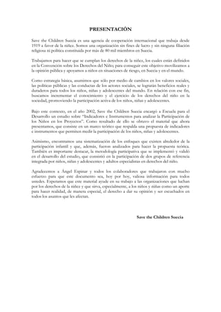 Este documento presenta los resultados de un estudio sobre la participación infantil realizado por la Escuela para el Desarrollo a pedido de Save the Children Suecia. El estudio tuvo como objetivos elaborar un marco conceptual de la participación infantil, construir una tipología de las formas de participación de los niños, y diseñar indicadores para medir la participación infantil. La metodología incluyó la participación activa de un grupo de niños y adolescentes en todas las etapas del estudio. Los resultados incluyen definiciones de la participación infantil, clasificaciones