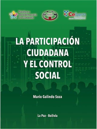 El documento presenta un resumen de un libro sobre la participación ciudadana y el control social en Bolivia. Explica que el libro actualiza los conceptos de participación ciudadana y control social en el contexto del nuevo Estado Plurinacional de Bolivia. También describe los diferentes órganos y niveles del gobierno boliviano y la descentralización a través de autonomías departamentales, municipales e indígenas. El libro analiza temas como la democracia participativa, la ciudadanía, la gestión pública y los instrumentos para ejercer el control social.
