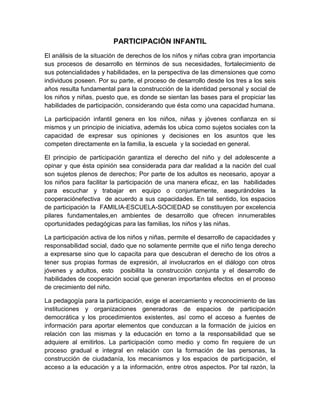 Este documento discute la importancia de la participación de los niños en la familia, la escuela y la sociedad para apoyar su desarrollo. Explica que la participación infantil ayuda a los niños a desarrollar confianza en sí mismos y responsabilidad social. También destaca que la familia, la escuela y la sociedad deben brindar espacios para la participación democrática de los niños y apoyar el desarrollo de sus habilidades para la cooperación y la resolución de problemas. El documento concluye enfatizando que