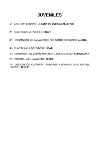 El documento lista los grupos de tambores y bombos que participaron en una competición, divididos en categorías de mayores, juveniles e infantiles. En la categoría de mayores, el primer puesto fue para la Asociación Cultural Alcora Tambor de Alcora y el último para la Asociación Tambores y Bombos Ciudad Mudéjar de Teruel. En juveniles, el primer puesto fue para la Sagrada Eucaristía de Ejea de los Caballeros y en infantiles, el primer puesto fue para la Cuadrilla El Encuentro de Hijar.