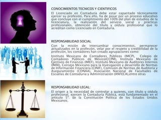 El documento describe las particularidades de la profesión de Licenciado en Contaduría. Para ejercer esta profesión, se requiere completar estudios de licenciatura, realizar servicio social y prácticas profesionales, y obtener el título y cédula profesional. Los contadores tienen responsabilidades técnicas, sociales y legales, y para mantenerse actualizados y proteger la credibilidad de la profesión, se agremien en organizaciones como el IMCP, CCPM, IMEF e IMAI.