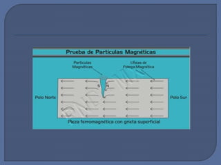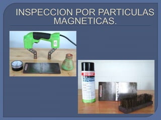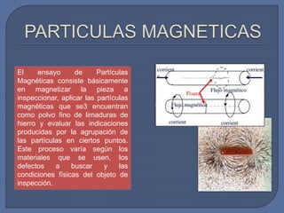 Este documento describe el método de ensayo no destructivo de partículas magnéticas. Explica que este método involucra la magnetización de una pieza y la aplicación de partículas magnéticas finas para detectar defectos al agruparse las partículas. También discute los diferentes tipos de aplicación de partículas (vía húmeda y vía seca) y los pasos básicos para realizar una inspección con este método.