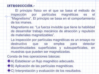Este documento resume la historia y principios fundamentales del método de inspección por partículas magnéticas. Comenzó en el siglo XIX cuando se observaron patrones de partículas metálicas sobre grietas en acero. Se basa en el magnetismo y consta de magnetizar una pieza, aplicar partículas magnéticas sensibles y analizar los resultados. Las partículas se orientan según las líneas de flujo magnético para indicar discontinuidades superficiales o subsuperficiales.