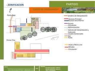 El documento describe dos opciones para conectar un lugar con la ciudad de Concepción: un sendero a caballo y un colectivo interurbano. El sendero llevará a los jinetes por esteros para luego ingresar a la ciudad, mientras que el colectivo pasará por puntos de interés cultural rodeando la plaza principal y varias calles antes de salir de la ciudad. El documento también incluye planos de zonificación y planimetría para tres elementos propuestos: un centro de interpretación, un centro de investigación y una posada.