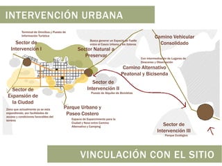 El documento presenta una propuesta de intervención urbana y arquitectónica para un parque ecológico llamado "Yagareté Cora" que busca generar un espacio de amortiguación entre la ciudad y los esteros. La propuesta incluye un terminal de ómnibus, un puesto de información turística, un parque urbano costero y un camping. Arquitectónicamente se proponen tres edificios principales - una posada, un centro de interpretación y un centro de investigación - que se articulan a lo largo de un eje