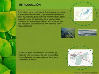Este documento presenta una propuesta de intervención para desarrollar el ecoturismo en la Reserva Provincial Iberá, ubicada en la provincia de Corrientes, Argentina. La propuesta incluye el desarrollo de infraestructura para el turismo como posadas, centros de interpretación, senderos y miradores en la ciudad de Concepción y en un terreno seleccionado, con el objetivo de promover el desarrollo económico sostenible de la región y concientizar sobre la importancia de la conservación de los humedales.