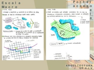 El documento presenta una propuesta de diseño para un complejo turístico ubicado en el Estero del Iberá. El complejo consta de un centro de investigación, un centro de interpretación, una posada y un espejo de agua. Los edificios se organizan alrededor del espejo de agua y siguen líneas rectas y curvas. El documento incluye planos, zonificación y detalles sobre la morfología y tecnologías propuestas para los edificios.