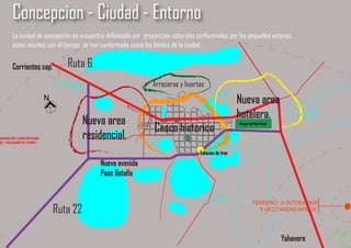 El documento presenta una propuesta urbana y arquitectónica para la ciudad de Concepción y un complejo turístico adyacente. La propuesta reordena las circulaciones de la ciudad, abre un nuevo ingreso desde la Ruta 6, y crea un paseo costero que conecta nuevas áreas. El complejo turístico incluye un centro de interpretación, una posada y senderos interpretativos, organizados de forma radial alrededor de caminos curvos. La propuesta busca integrarse delicadamente al entorno natural y promover la sustentabilidad.