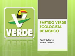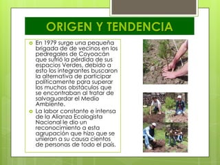 El documento describe el origen y evolución del Partido Verde Ecologista de México. Comenzó como un grupo de vecinos preocupados por la pérdida de espacios verdes en la década de 1970. Más tarde se convirtió en una ONG dedicada a crear conciencia ecológica y finalmente fundó el partido político en 1986 aunque no logró registrarse hasta 1991. Actualmente el Partido Verde tiene representación en la Cámara de Diputados y el Senado.