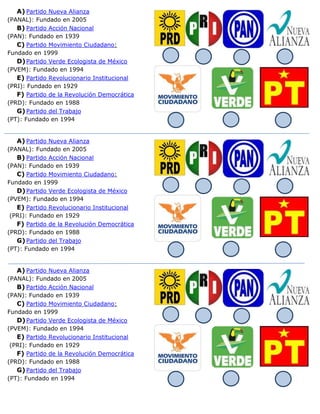El documento lista 7 partidos políticos de México y el año en que fueron fundados, incluyendo el PRI fundado en 1929, el PAN fundado en 1939, el PRD fundado en 1988, el PVEM y PT fundados en 1994, el PANAL fundado en 2005 y el Partido Movimiento Ciudadano fundado en 1999.