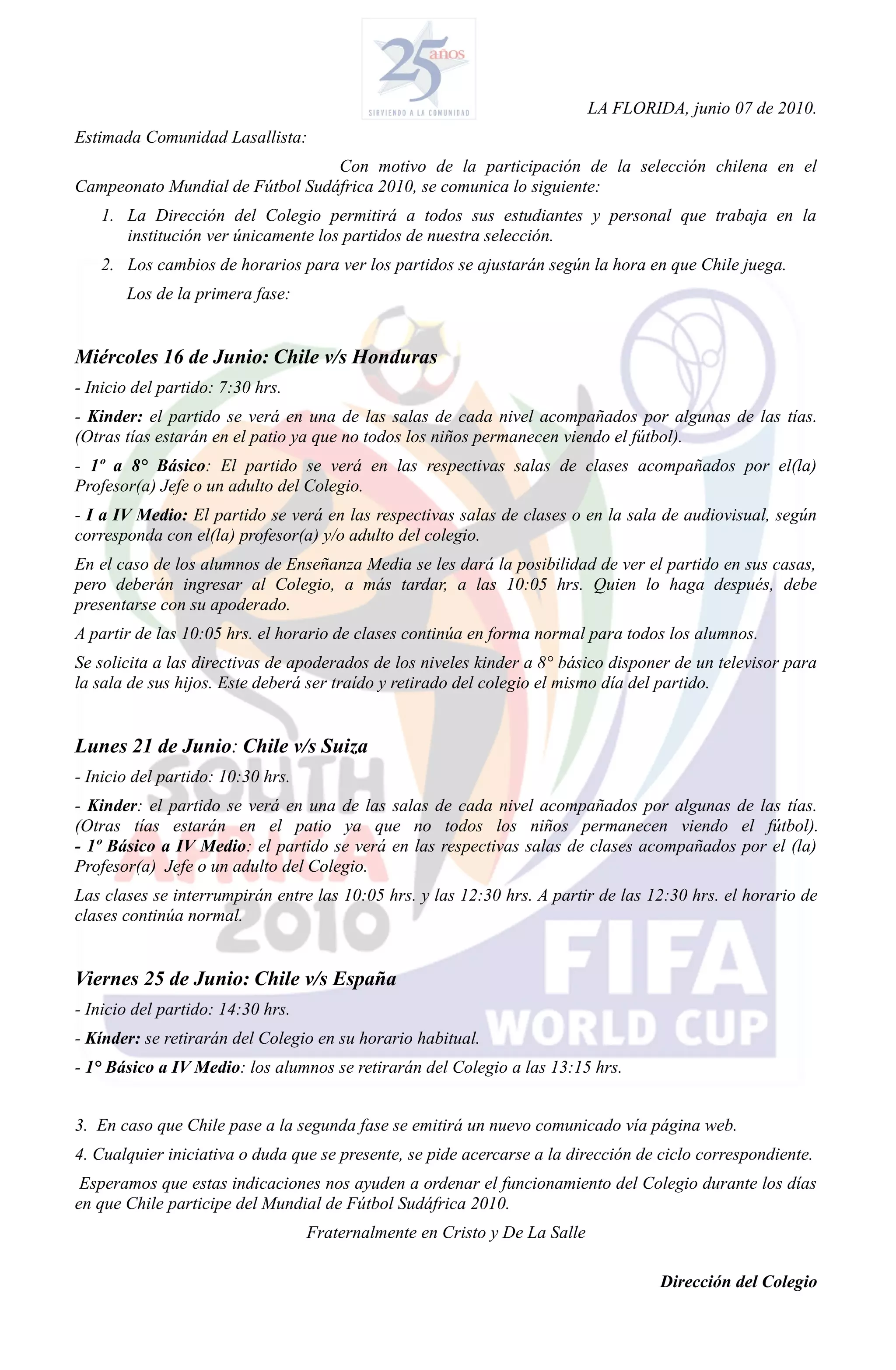 El documento detalla los ajustes que hará un colegio chileno en sus horarios para que estudiantes y profesores puedan ver los partidos de la selección chilena en el Mundial de Fútbol de 2010. Se especifican los horarios de los tres partidos de la primera fase, indicando cómo se transmitirán en cada nivel educativo, e informando que se emitirá un nuevo comunicado si Chile pasa a la segunda fase.