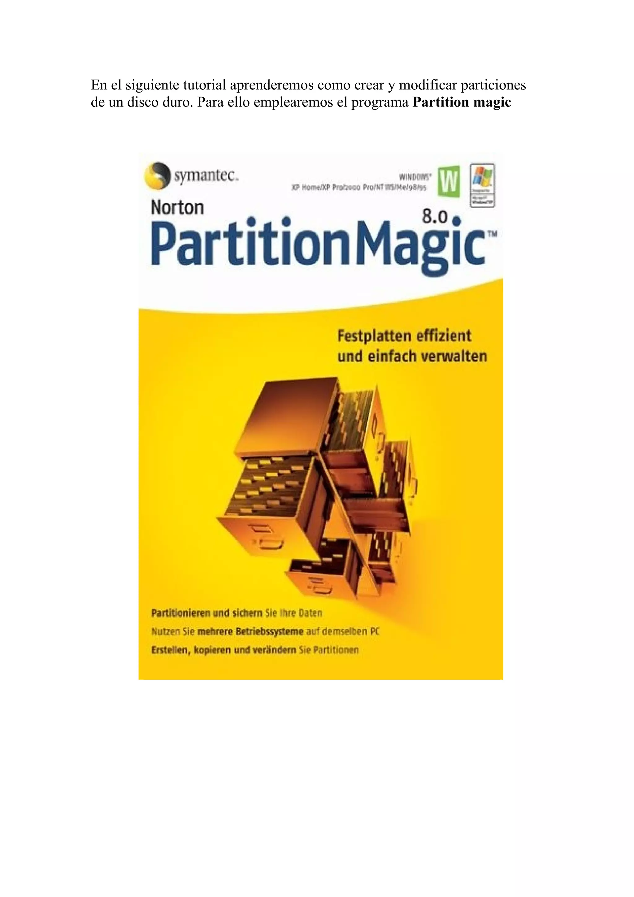 Este documento explica cómo usar el programa Partition Magic para crear y modificar particiones en un disco duro, incluyendo abrir el programa, hacer clic derecho en el disco duro para acceder a opciones de partición, crear particiones primarias o lógicas y elegir un formato, y modificar particiones ocultándolas o cambiando su formato.