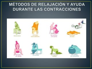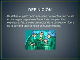 El documento describe el proceso del parto, que incluye etapas como borramiento y dilatación del cuello uterino, expulsión del feto y alumbramiento, con una duración que varía según el número de partos previos. Se detallan las fases del trabajo de parto: latente, activa y de transición, así como la importancia del control de contracciones y la recuperación post-parto. Además, se menciona el test de Apgar para evaluar la condición del recién nacido y la necesidad de administrar ocitocina para el control de la hemorragia.
