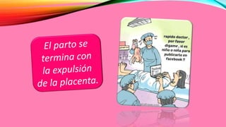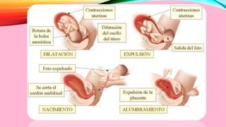 Este documento describe el proceso del parto y el puerperio. El parto es un proceso fisiológico anunciado por contracciones uterinas rítmicas que causan el descenso y nacimiento del bebé. El puerperio se extiende desde el final del parto hasta 6-8 semanas después y comprende la recuperación del útero y los genitales. Se divide en etapas inmediata, media, alejada y tardía, durante las cuales ocurren cambios como la involución uterina, recuperación de peso, loquios